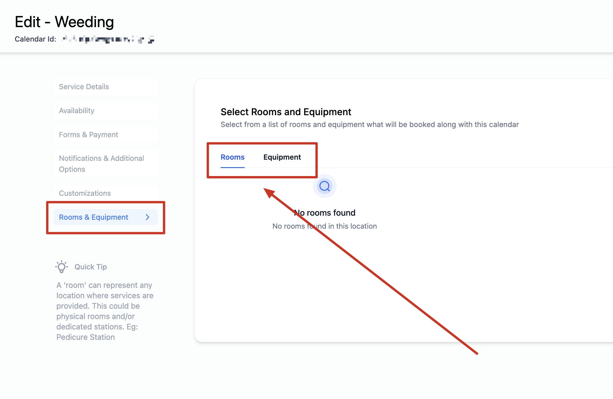 You can select from a list of rooms and equipment that have been created. This will associate the selected rooms / equipment with the service calendar and will be booked along with this calendar.