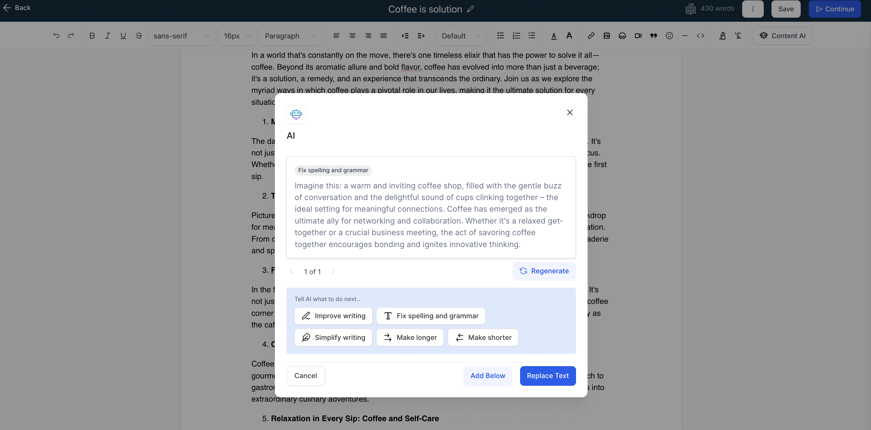 If you would like to generate the text using AI, in the text editor bar there will be an option of Content AI. If you already have text, select the text in the blog post to do the following: