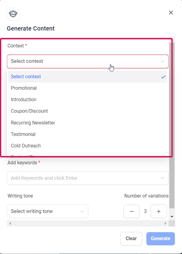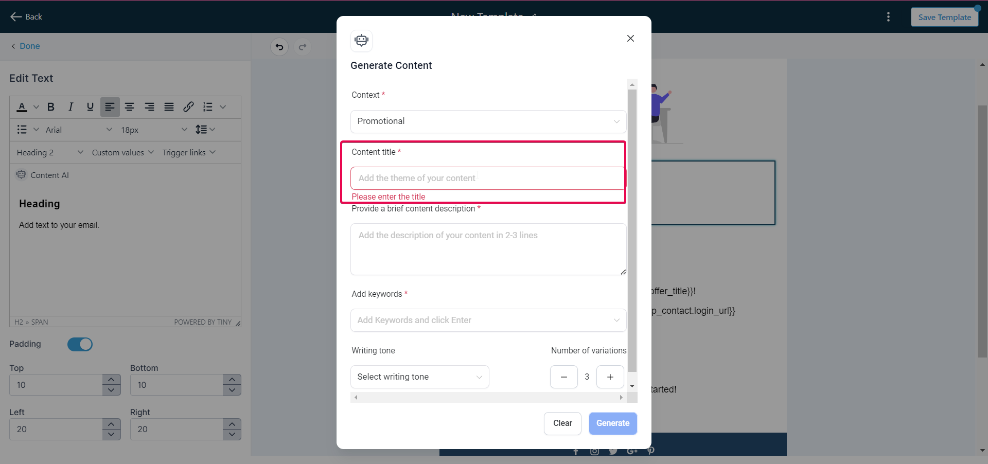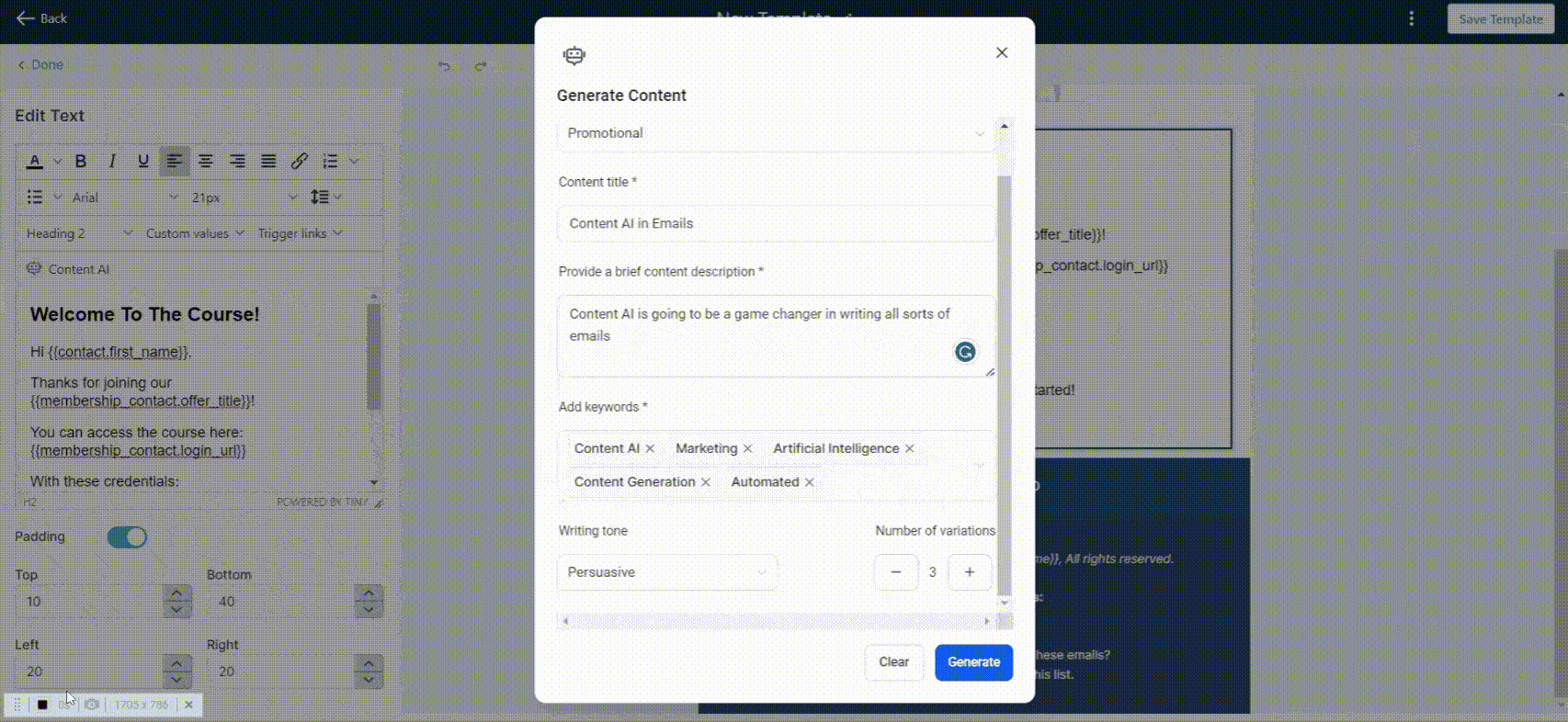Writing assistant Content AI helps generate 10X faster, more effortless, and better Content. Content AI in Emails generates outlines, introductions, specific sections, and variations for different email contexts, including promotional emails, introduction emails, coupons/discounts, recurring newsletters, testimonials, cold outreach, and content/giveaways. It can also be used to create subject lines and variations. Using Content AI in Emails makes creating email content faster and more efficient while allowing for tailored Content based on specific business needs.