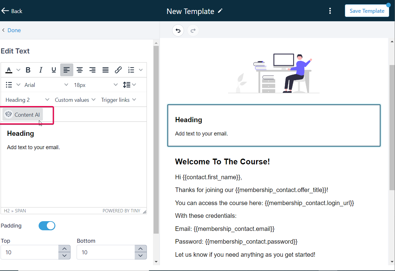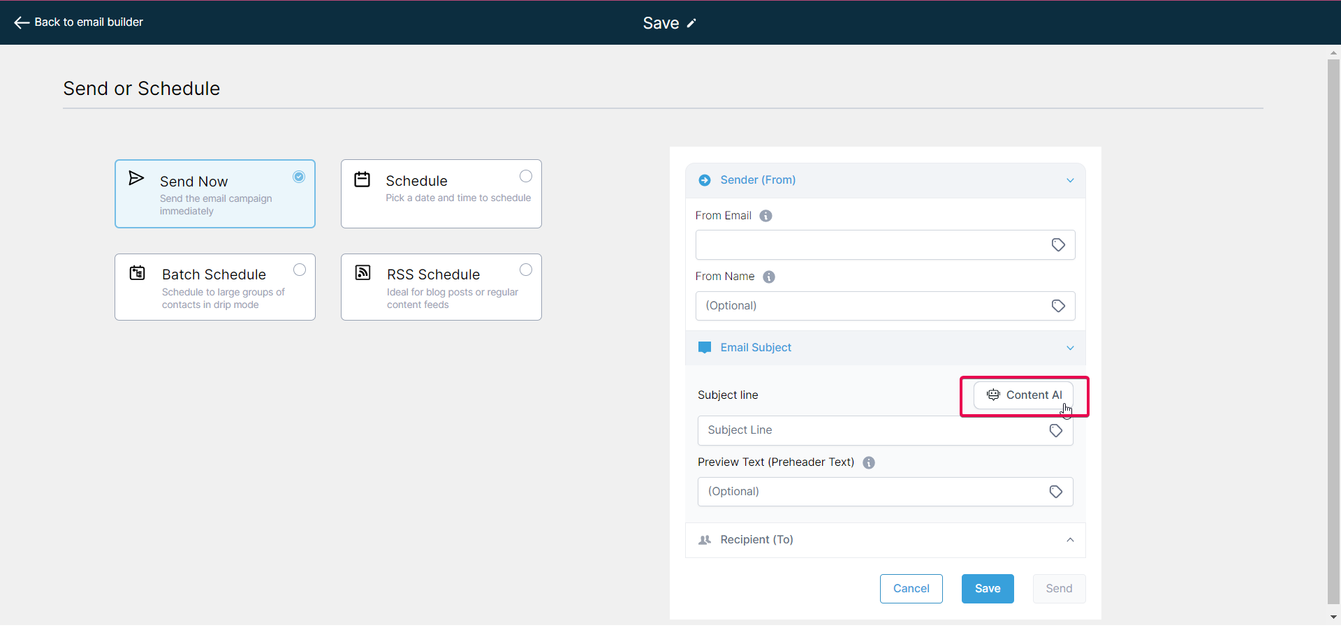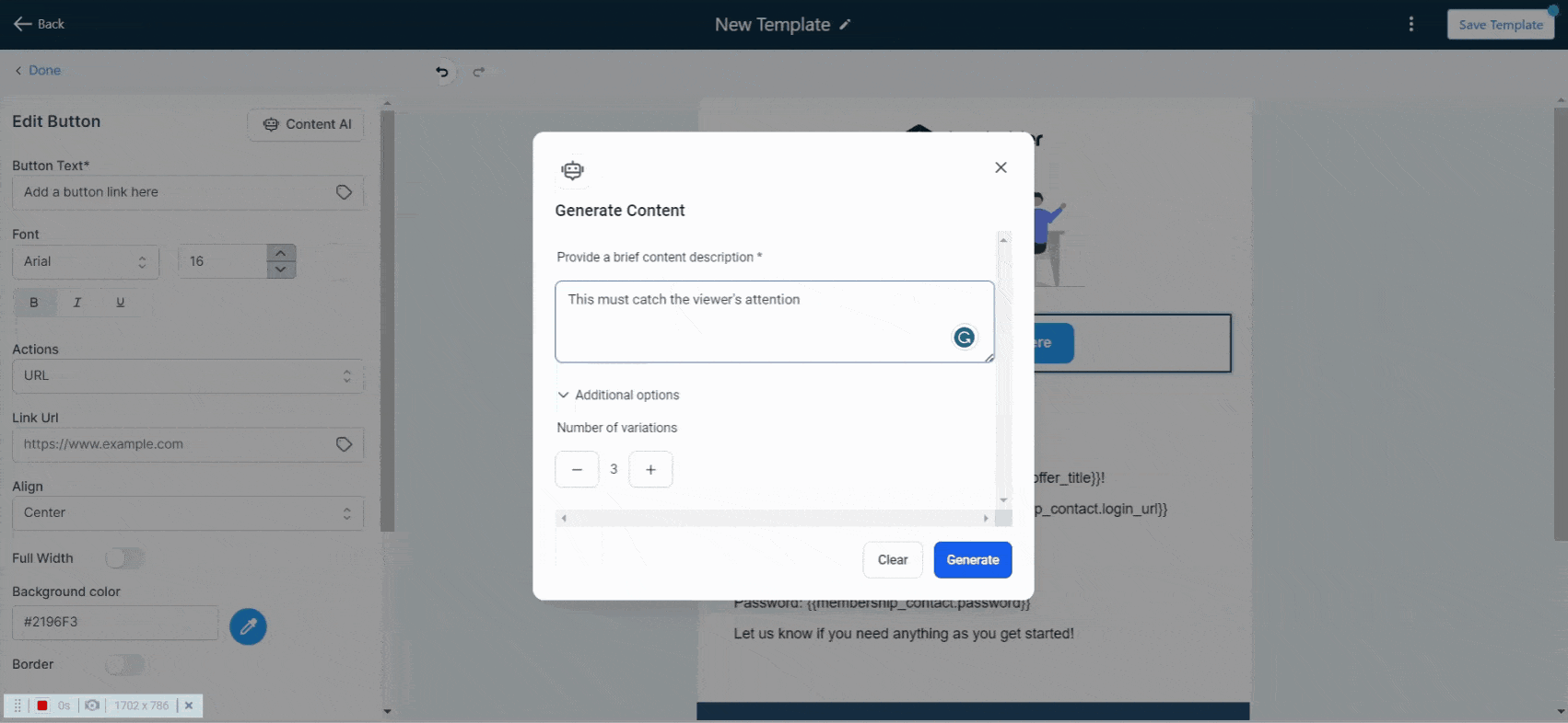 Writing assistant Content AI helps generate 10X faster, more effortless, and better Content. Content AI in Emails generates outlines, introductions, specific sections, and variations for different email contexts, including promotional emails, introduction emails, coupons/discounts, recurring newsletters, testimonials, cold outreach, and content/giveaways. It can also be used to create subject lines and variations. Using Content AI in Emails makes creating email content faster and more efficient while allowing for tailored Content based on specific business needs.
