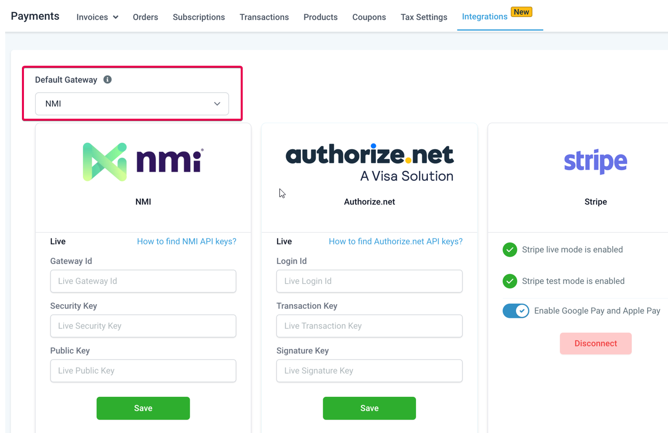 No, you are not required to disconnect Stripe to connect to NMI. You can connect to both gateways on the integrations page. However, since you have connected two gateways for processing payments, you must define a default gateway for processing order form payments.