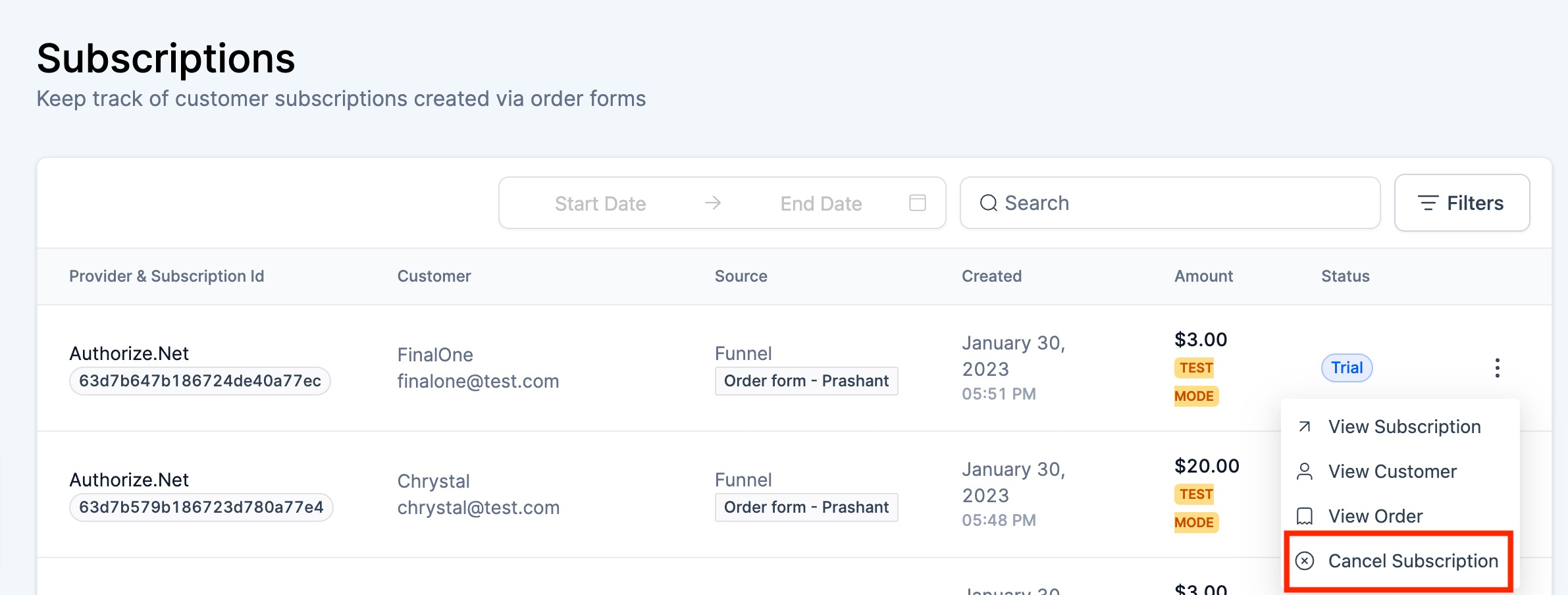 Subscriptions created using NMI/Authorize.net can be canceled within the Subscriptions page using the 'Cancel Subscription' action.