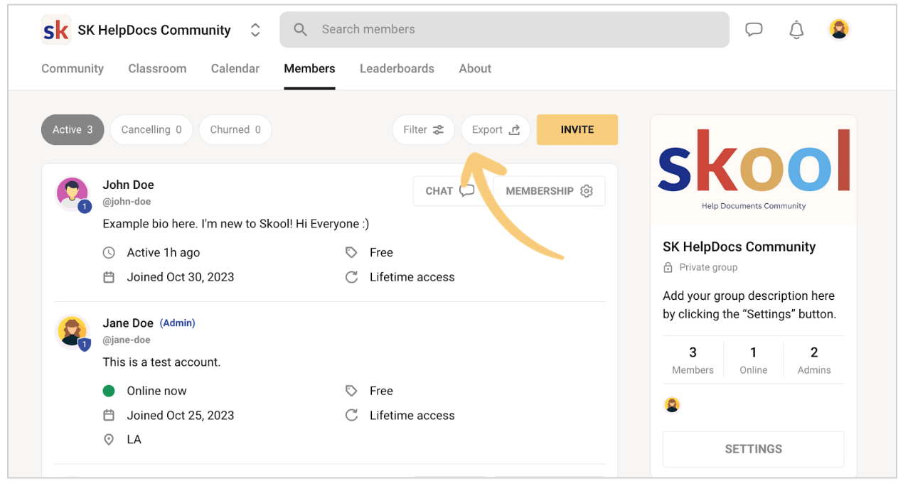 Export Members: In Skool, navigate to the Members section and use the export function to download the member list as a CSV file, including names, emails, and any custom fields.