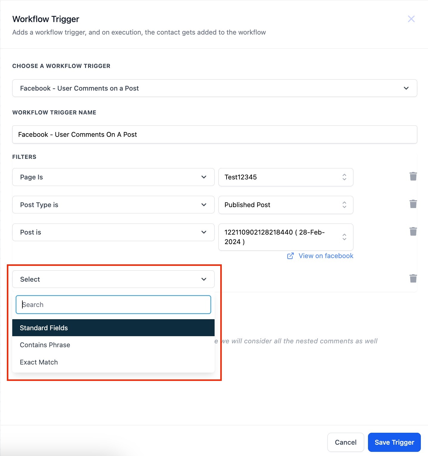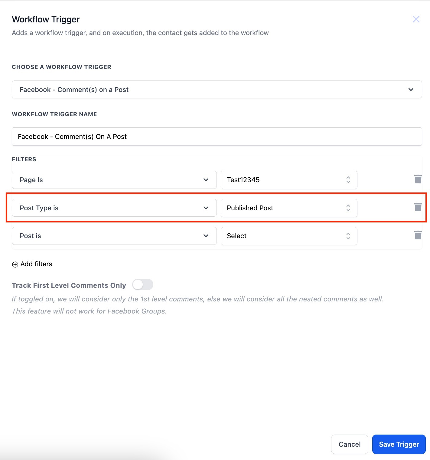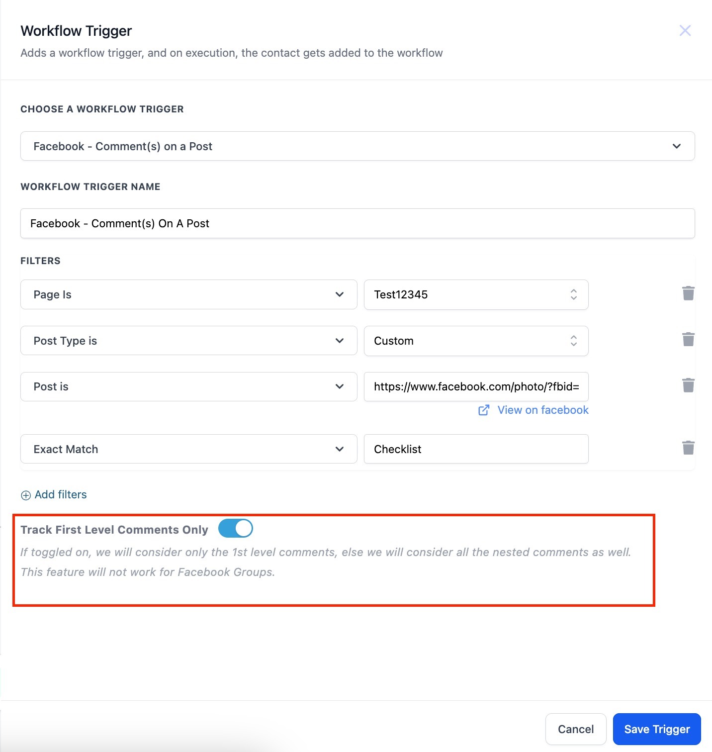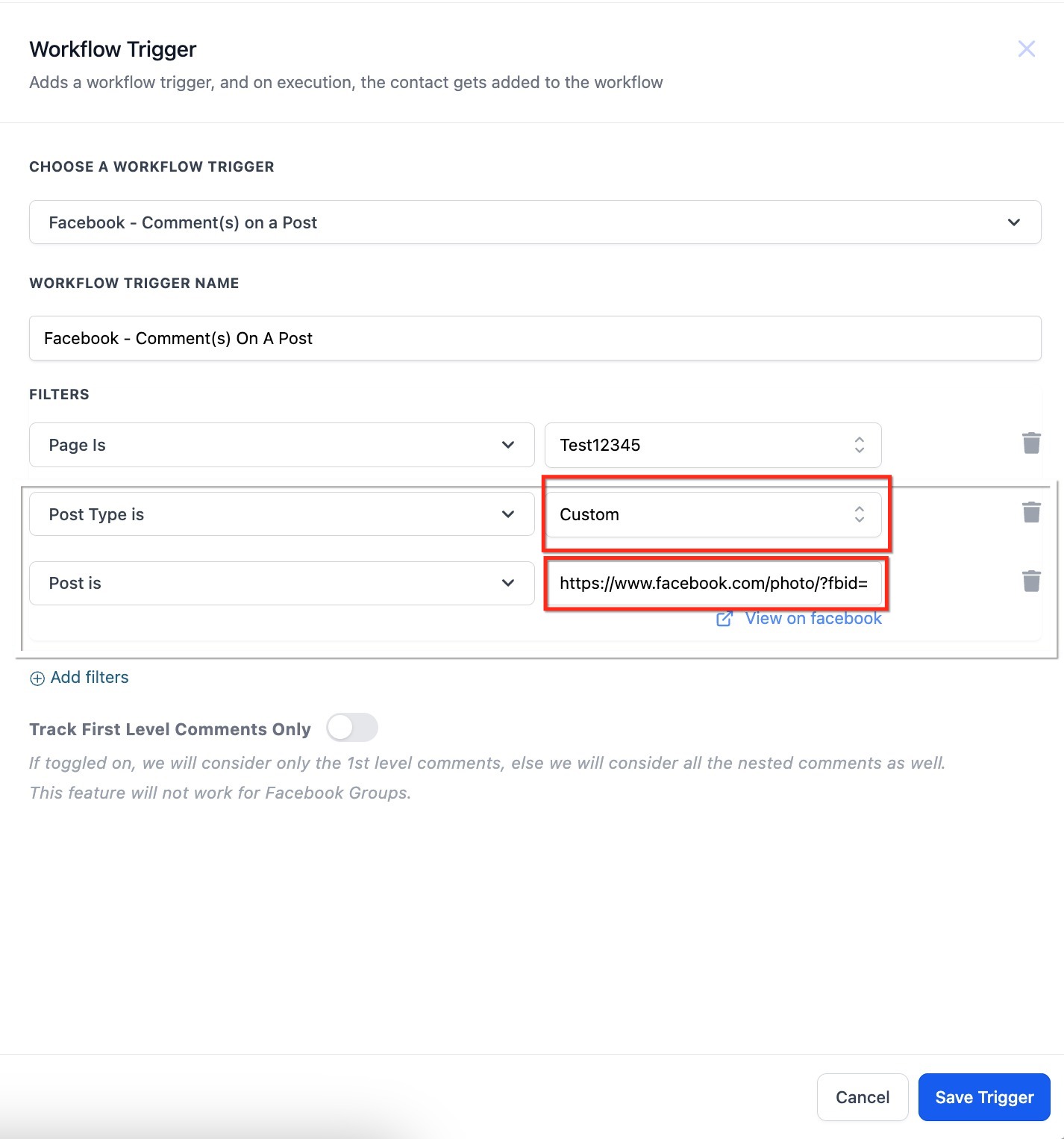 This trigger is fired when a comment on your Facebook post(s) matches the filters you set.