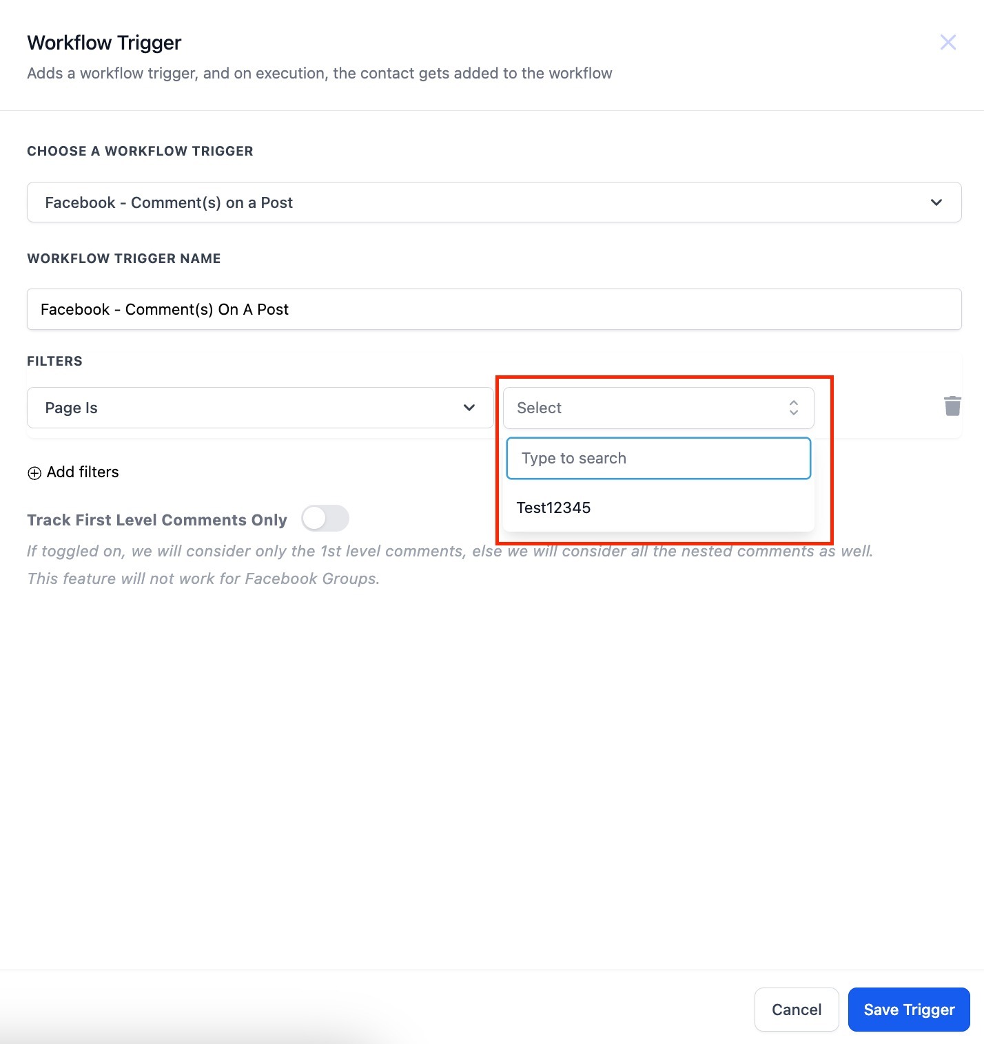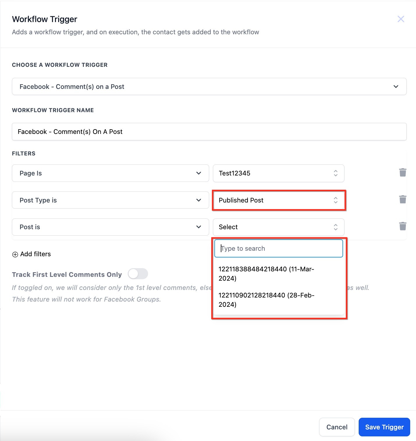 - Track First Level Comments Only: This toggle, when off, will allow the trigger to fire for all nested comments. When it is toggled on, then the trigger will only fire for the top (first) comment, not for comments under that comment.