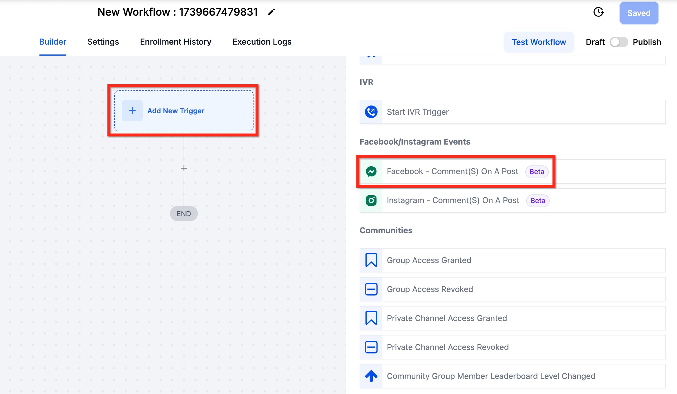 Navigate to Automations > Workflows > Workflow Builder > Triggers > Facebook/Instagram Events.
