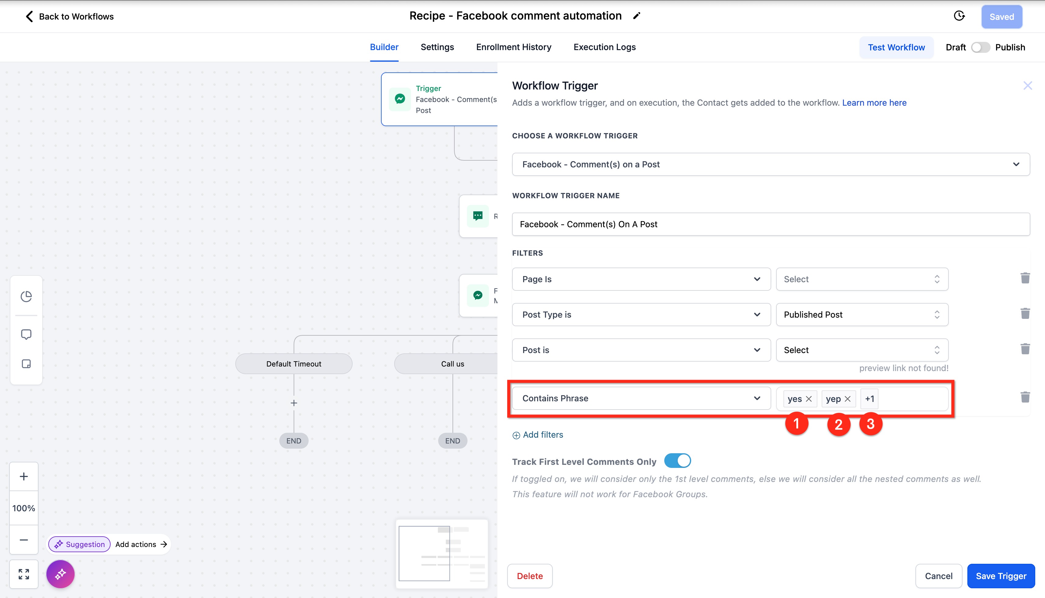 - Contains Phrase: the trigger will fire if the body of the comment contains one of the exact text strings you provide.