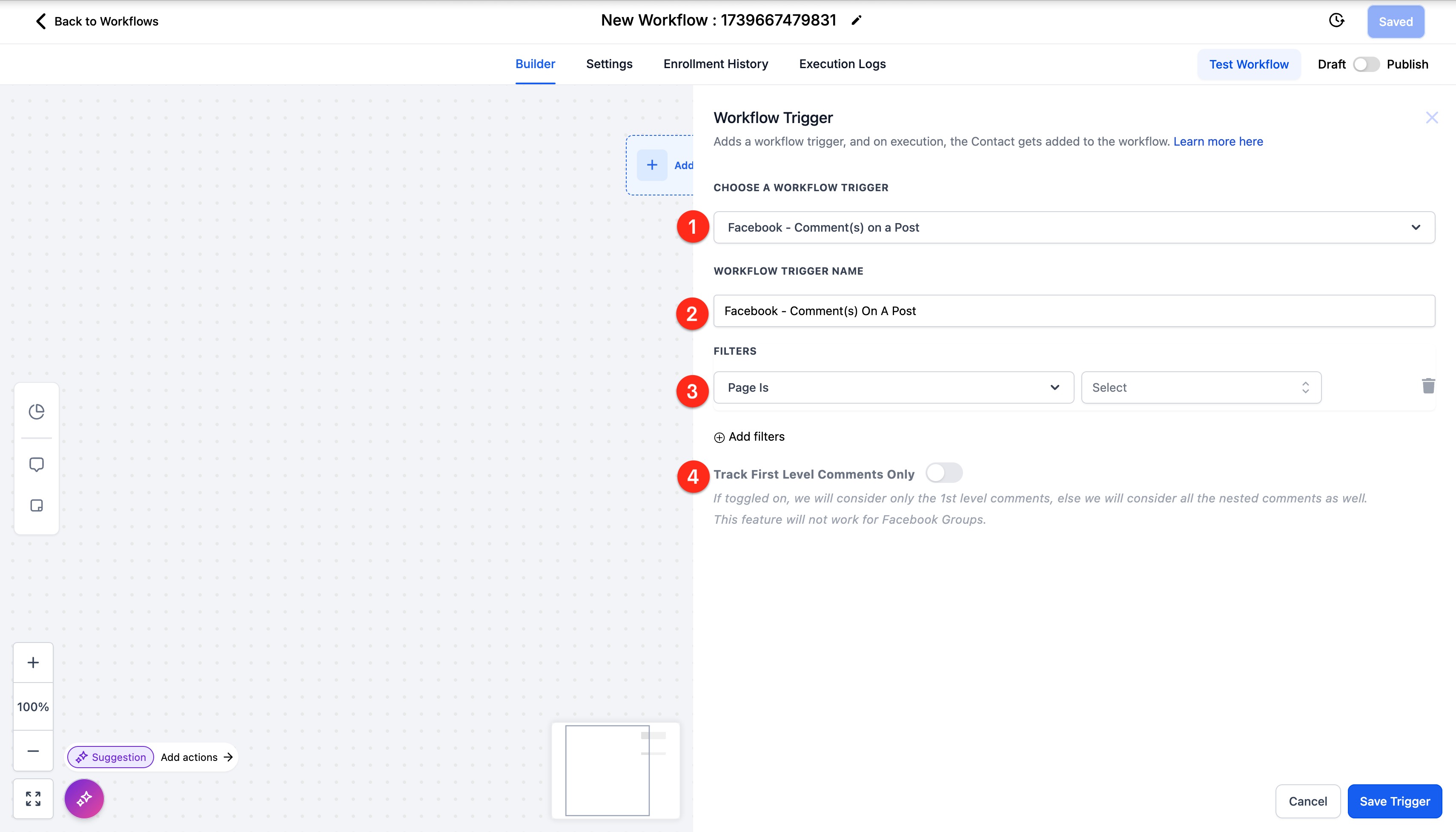 There are four (4) primary components of the Workflow Trigger - Facebook Comment(s) On A Post: